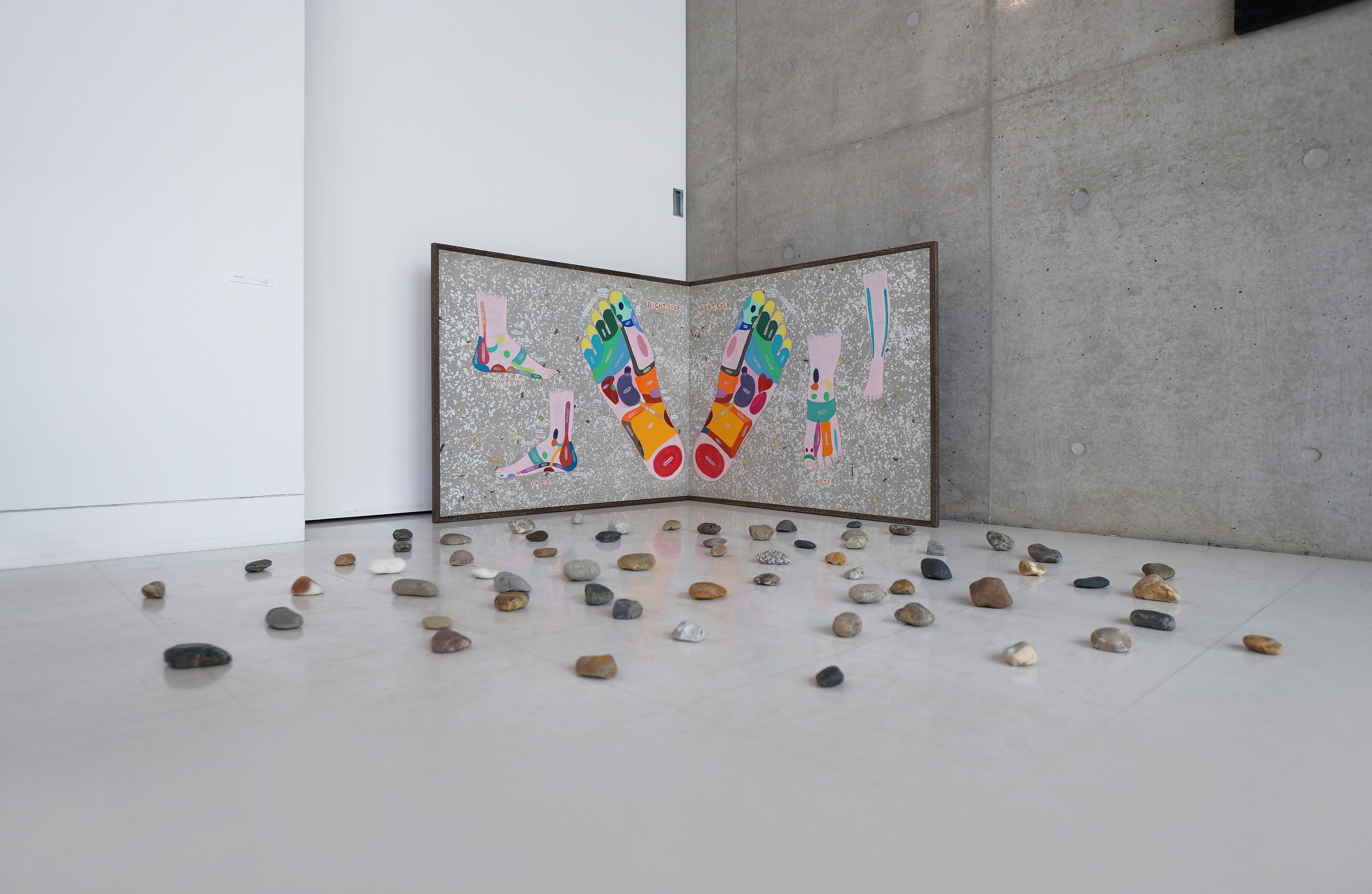 風炉先屏風にアクリル絵の具でペイント・海岸の石63個 / 2025